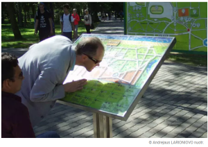 Liepojoje jau kita situacija, parke kelią į paplūdimį „rodo“ (kaip ir didžiojoje miesto dalyje) specialiai nutiesti šaligatviai regėjimo negalią turintiems žmonėms, žemėlapiai pritaikyti skaityti pirštais, t. y. be įprastos mums vaizdinės/informacinės medžiagos, yra Brailio raštas, patys žemėlapiai ir jo nurodomieji ženklai yra pagaminti reljefiniu būdu (pritaikyti skaityti pirštais), kad galima būtų apčiuopti kiekvieną kryptį ir visą žemėlapio planą. Tai sužadina vietovės įsivaizdavimą ir palengvina orientavimąsi.